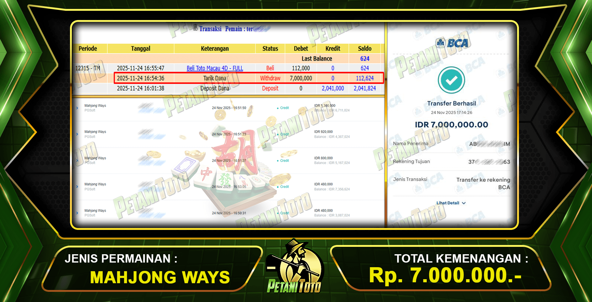 BUKTI GACOR SLOT MAHJONG WAYS KASIH 7 JUTA DI PETANITOTO