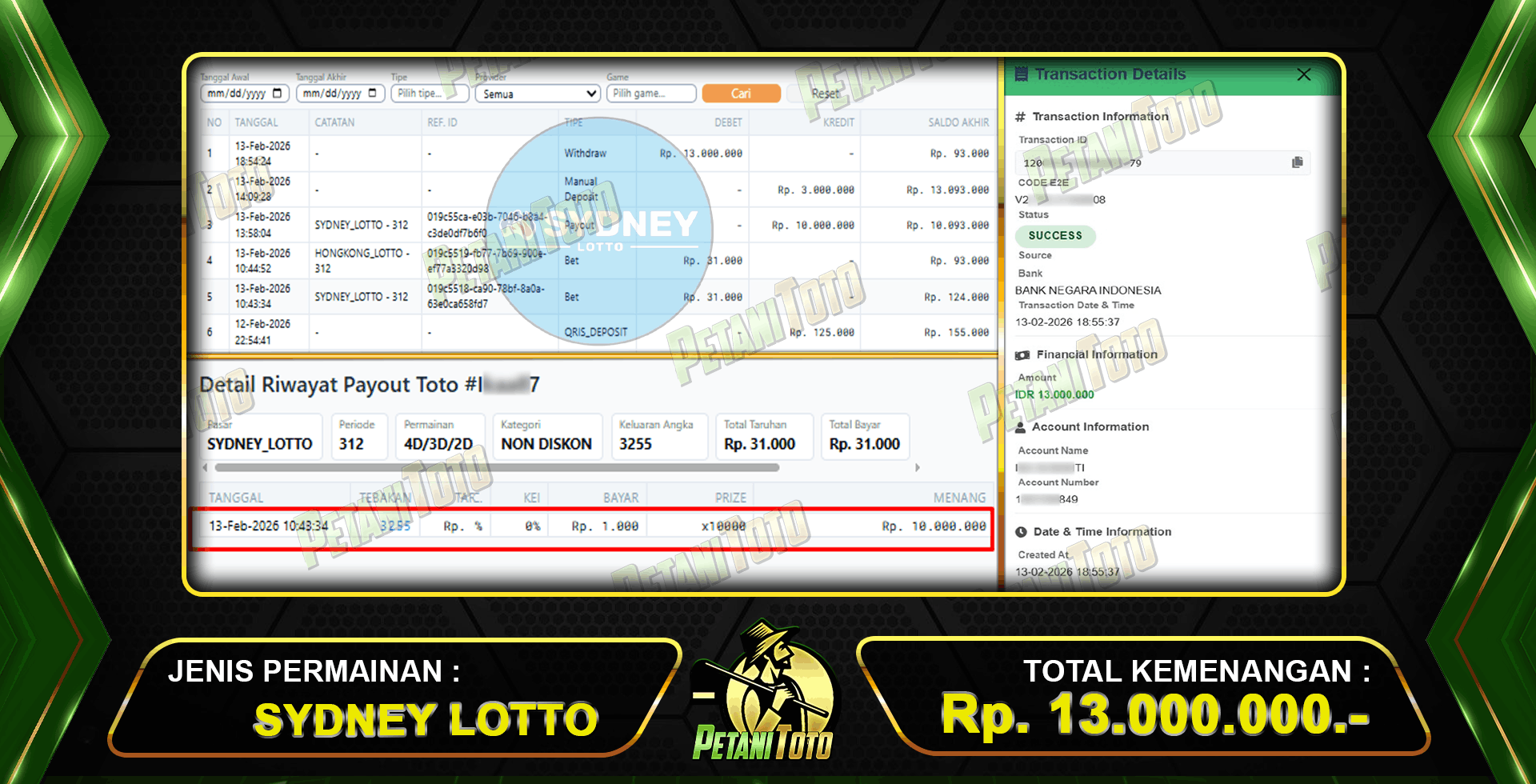 PAUS SYDNEY LOTTO PETANITOTO – Selamat kepada user ID : Ik**** Karena telah berhasil withdraw sebesar Rp13.000.000 yang menang di pasaran togel SYDNEY LOTTO, Yang telah kami bayar lunas dalam waktu singkat. Oleh karena itu kami ucapkan selamat kepada member yang berhasil menang di Pasaran togel SYDNEY LOTTO.
