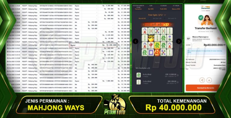 Bukti Jackpot PETANITOTO - Selamat kepada user ID : KOC******10 karena berhasil withdraw sebesar Rp. 40,000,000 di game MAHJONG WAYS,...