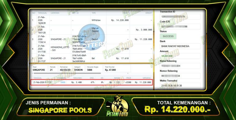 JP SINGAPORE BERSAMA PETANITOTO - Selamat kepada user ID : 84r***** Karena telah berhasil withdraw sebesar Rp 14.220.000 yang menang di...