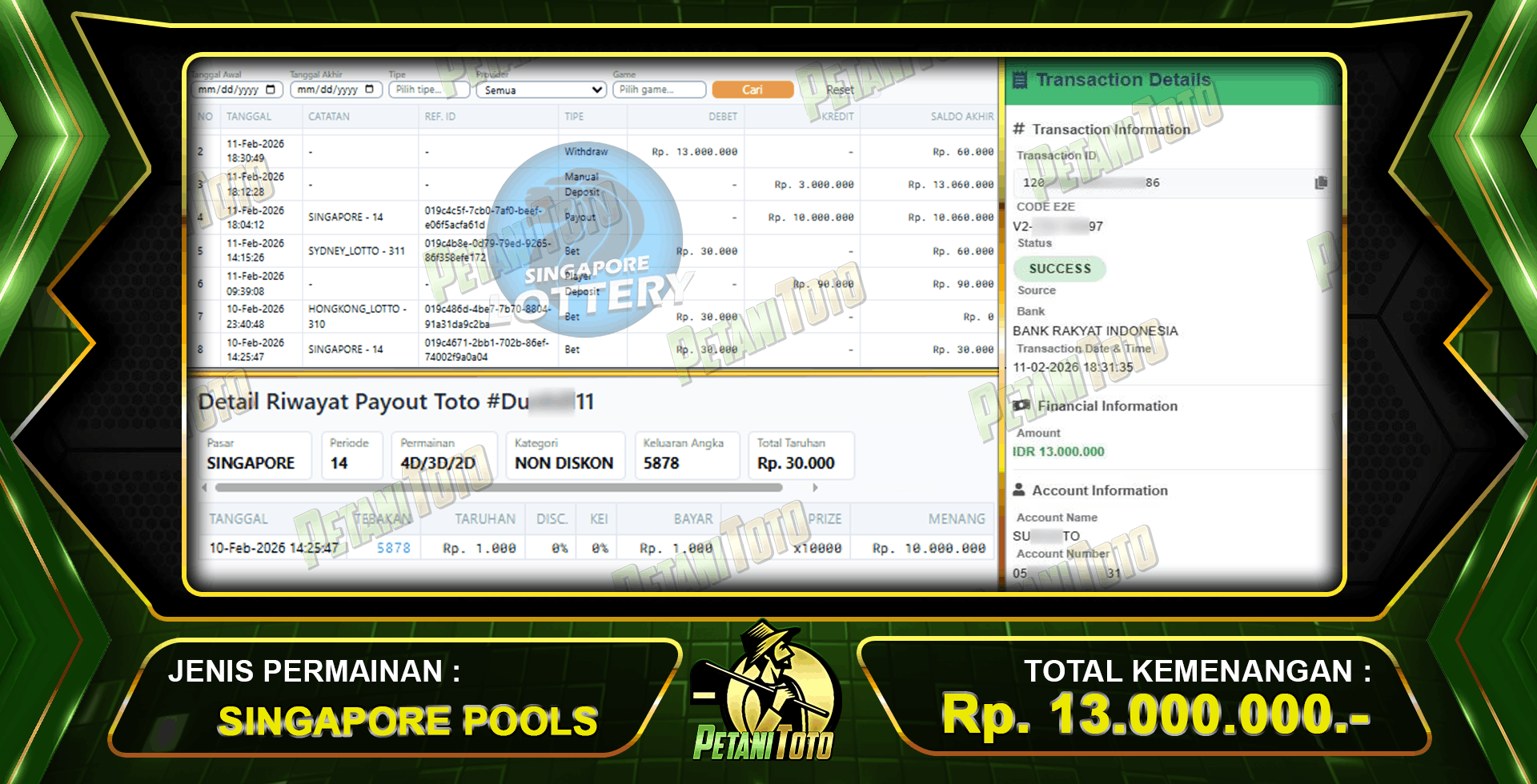 JP PAUS SINGAPORE PETANITOTO – Selamat kepada user ID : D*****1 Karena telah berhasil withdraw sebesar Rp 13.000.000 yang menang di pasaran togel SINGAPORE POOLS, Yang telah kami bayar lunas dalam waktu singkat. Oleh karena itu kami ucapkan selamat kepada member yang berhasil menang di pasaran togel SINGAPORE POOLS.