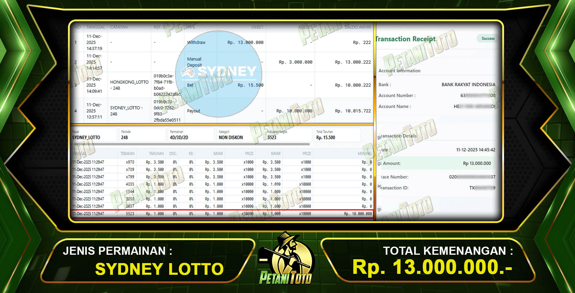 SPIN SYDNEY LOTTO PETANITOTO – Selamat kepada user ID : Blo***** Karena telah berhasil withdraw sebesar Rp 13.000.000 yang menang di pasaran togel SYDNEY LOTTO, Yang telah kami bayar lunas dalam waktu singkat. Oleh karena itu kami ucapkan selamat kepada member yang berhasil menang di Pasaran togel SYDNEY LOTTO.