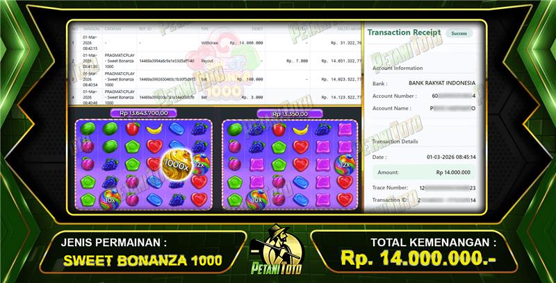SWEET BONANZA PETANITOTO GACORR – Selamat kepada user ID : pri**** karena telah berhasil withdraw sebesar Rp. 14.000.000 yang menang di SWEET BONANZA 1000, Yang telah kami bayar lunas dalam waktu singkat. Oleh karena itu kami ucapkan selamat kepada member yang berhasil menang di SWEET BONANZA 1000.Namun Tidak sedikit para penggemar situs PETANITOTO yang menyaksikan semua kemenangan dibayar tuntas tanpa repot. Oleh sebeb itu, Jika anda sedang mencari situs resmi aman dan terpercaya maka situs PETANITOTO siap sedia menjadi rekan betingan anda. Situs PETANITOTO sudah pasti selalu berikan kenyamanan dan kepercayaan pada pembayaran setiap penarikan dana yang dilakukan oleh ratusan ribuan member setiap saatnya.